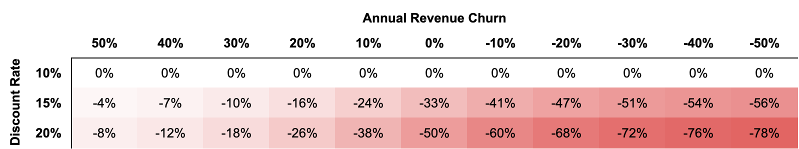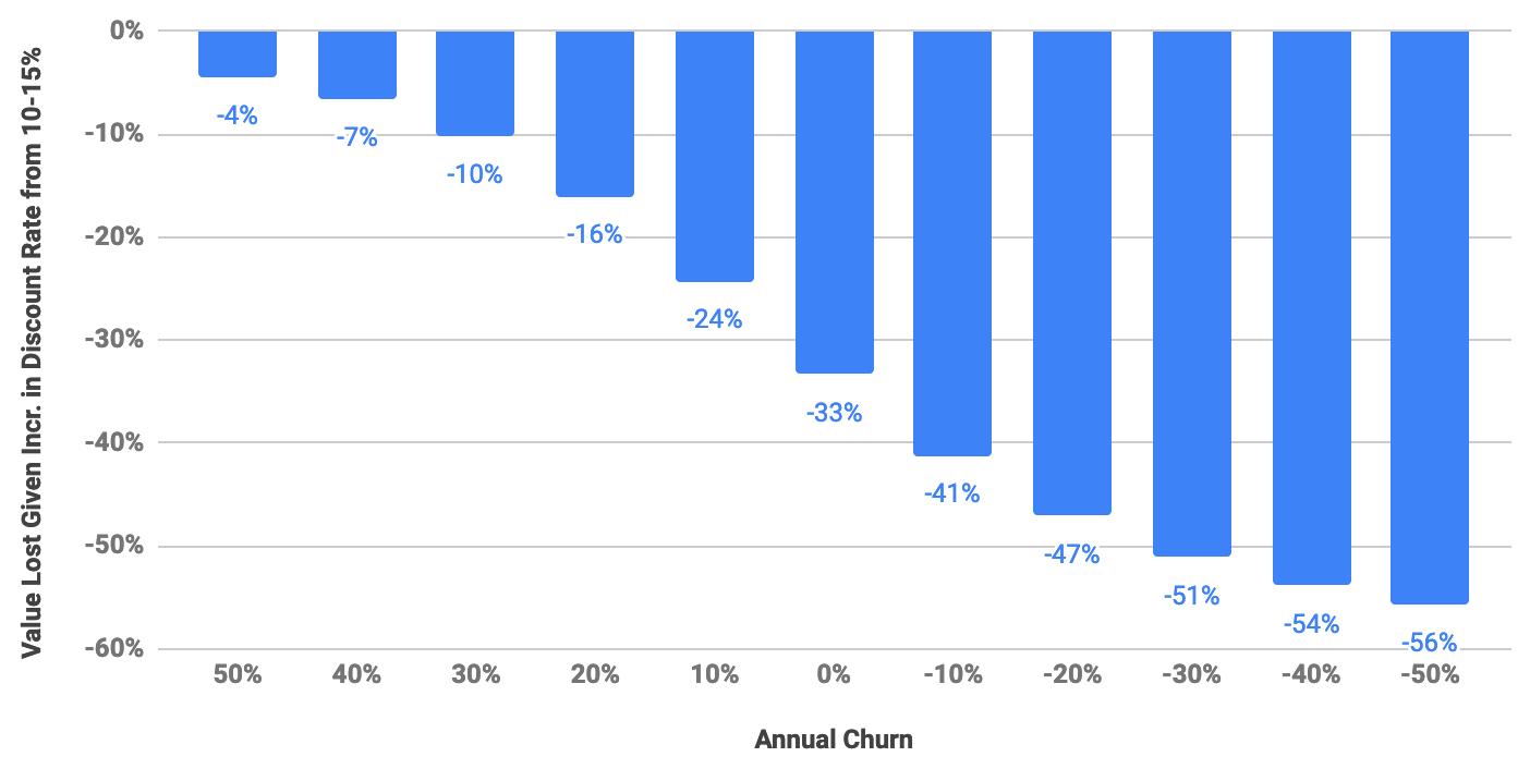 Notice how a company with 30% annual revenue churn only sees a 10% impact from a similar change in discount rate. This reflects the non-linear impact of the discount rate with respect to retention described earlier: