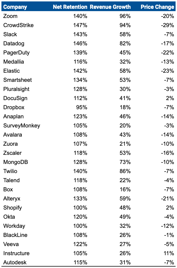 I assembled the following set of SaaS stocks, finding their latest revenue growth and net retention data, along with the price decline they saw from 9/21 to 10/21.