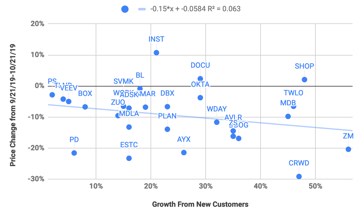 And for good measure, if we decompose overall growth and examine the component reflecting only the addition of new customers (1 + overall growth - net retention), we see little correlation with the recent movement in SaaS stocks: