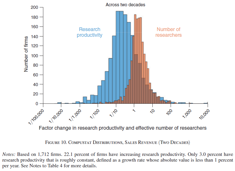 The chart below plots the growth in the number of employed researchers and their productivity levels (measured in terms of revenue growth generated per researcher) for ~1,700 publicly-traded U.S.-based companies over a 20-year period. Most firms “threw more bodies at the problem” (orange histogram > 1), but ~80% of firms saw declining research productivity (blue histogram < 1):