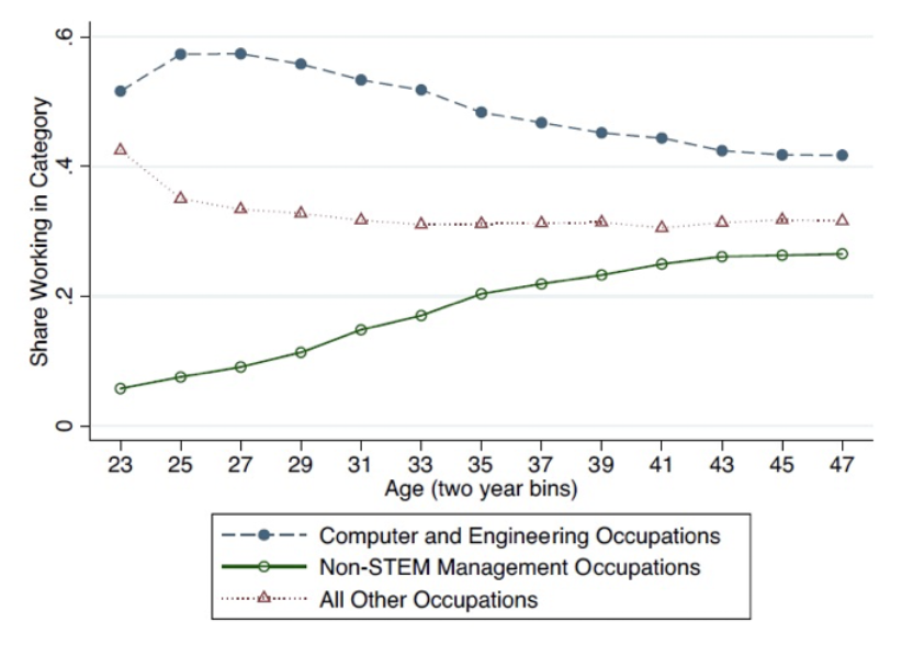 At age 26, 59% of engineering and computer science grads work in occupations related to their field of study. By age 50, only 41% work in the same domain, meaning a full ~30% drop out of the field by mid-career