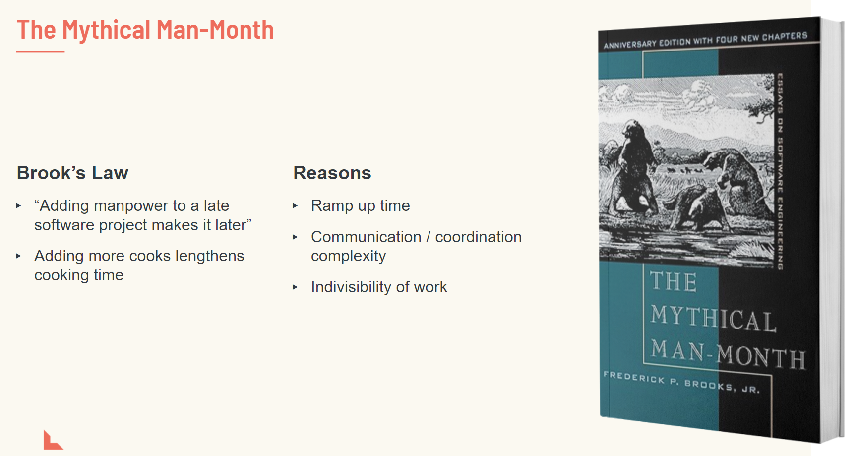 “The Mythical Man-Month” is a classic and hugely influential book about software engineering and project management. Across a series of essays, Fred Brooks (himself a former IBM project manager) lays out the cognitive errors software development teams tend to make in estimating the time to completion for software projects. His core thesis is best encapsulated by Brooks’ law.