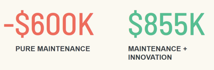 We can quantify the impact of engineering time spent maintaining old code rather than writing new code. According to one analysis, an engineer engaged in purely non-innovative activity destroys nearly $600K in employer market value. On the other hand, the average engineer, working on a combination of maintenance and innovation activities, adds $855K in market value to their employer.