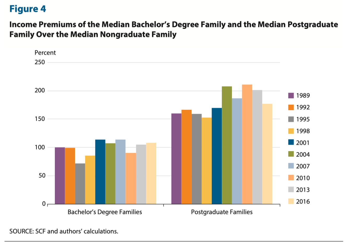 In words — the median family with a bachelor degree-holding head of household earns ~100% more income than the median family without a college degree.