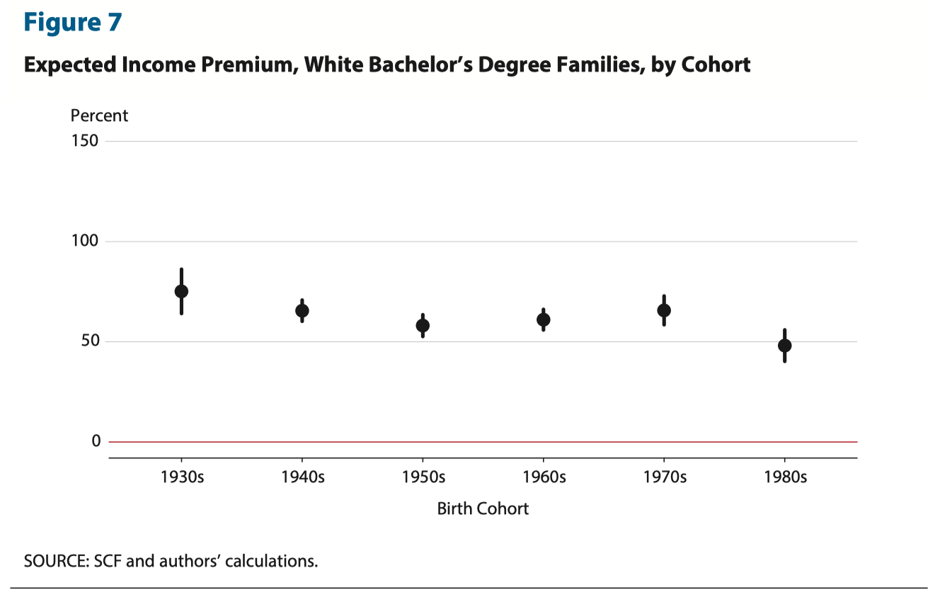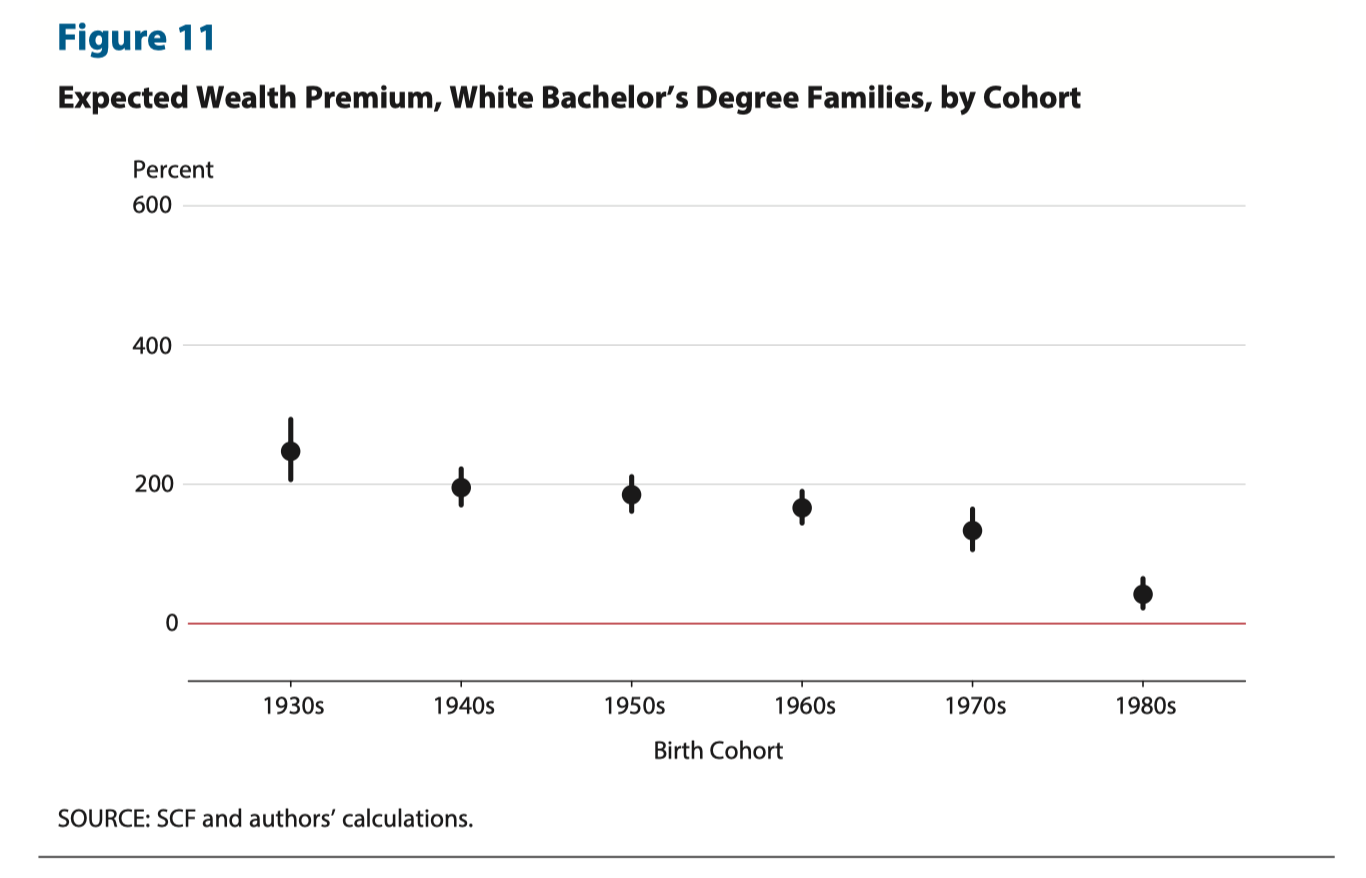 What does this say? A white college graduate born in the 1930s could have expected to achieve 247% higher net worth than their non-college educated peers, while one born in the 1980s can only expect to own 42% more.