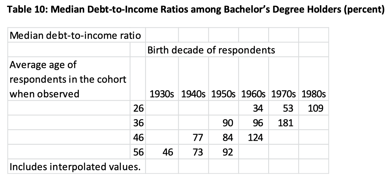 These surging costs are fueling an explosion of consumer debt. We can get some sense of this from the following table, which shows the median debt-to-income ratios among college degree holders across multiple birth decades at various years of age: