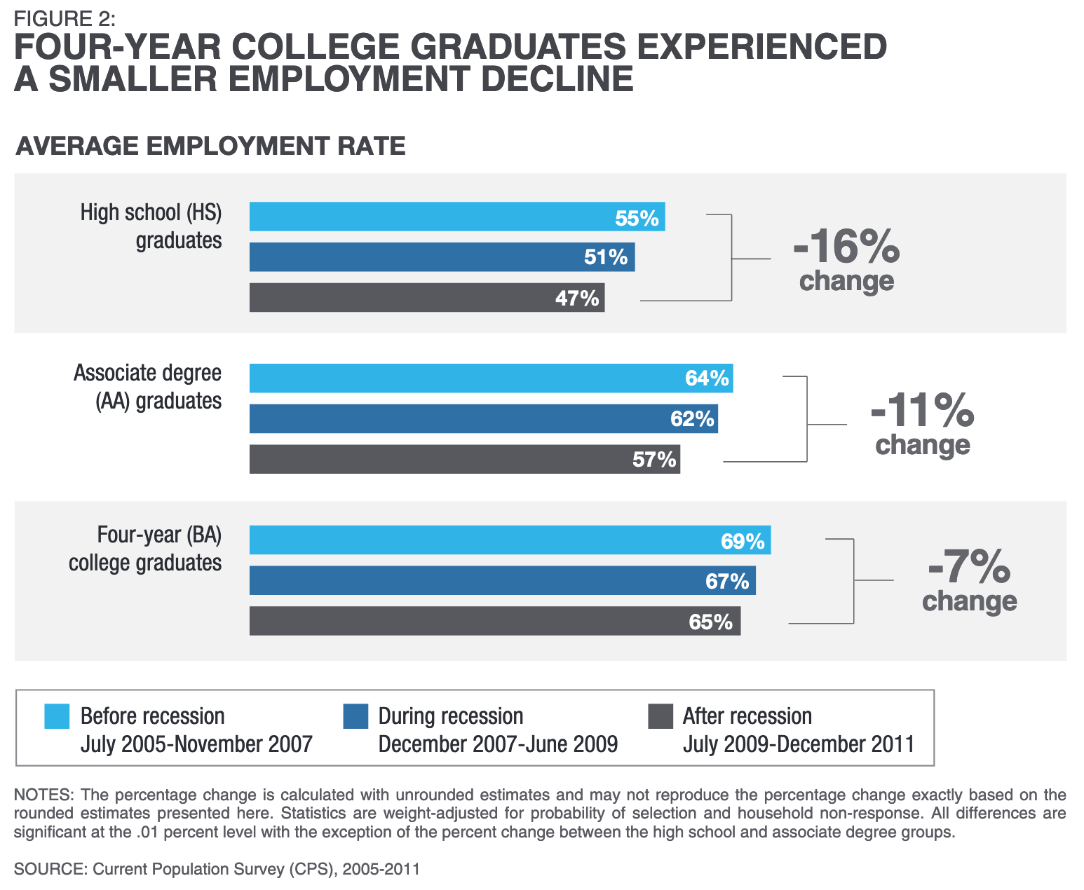 College graduates do better in recessions than non-graduates. Their incomes do not fall as significantly, nor do their unemployment rates surge to the same extent, as we can see in data from the Great Recession: