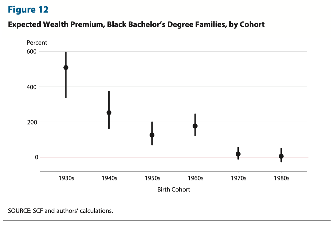 While the 1930s cohort (an extremely small group it should be noted) could be expected to own 509% more wealth compared to similarly aged blacks without a degree, those born in the 1980s only achieve 6% more wealth as a result of their degree, an effect “statistically indistinguishable from zero,” as the researchers put it.